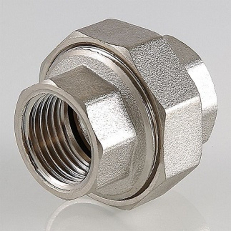 Латунная никелированная разъемная муфта. Резьба – внутренняя/внутренняя, цилиндрическая трубная по ГОСТу 6357 (ISO 228, EN 10226), совместима также с наружной конической трубной резьбой по ГОСТу 6211 (ISO R7). Соединение частей муфты осуществляется с помощью накидной гайки. Уплотнительное кольцо выполнено из синтетического каучука EPDM.